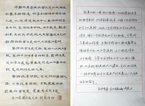 近日,為慶祝中國共產(chǎn)黨成立95周年,積極推進“兩學(xué)一做”活動深入開展,提升黨員、職工的文化藝術(shù)素養(yǎng)和書寫能力,進一步構(gòu)建和諧企業(yè)、和諧社會,不斷營造企業(yè)職工愛國愛黨、崇德向善的濃厚氛圍,金洲集團黨工團聯(lián)合開展“手抄黨章”比賽活動。本次比賽得到了廣大黨員、職工的積極參與,共收到120余件作品,其中2件作品全文抄錄黨章。