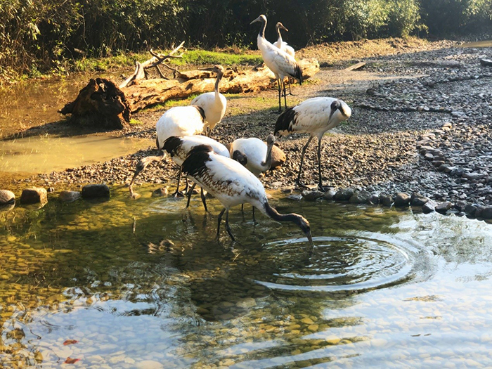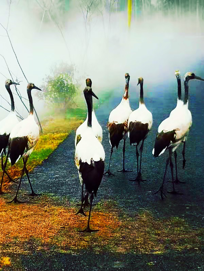 丹頂鶴互動區(qū)內(nèi)覓食的群鶴