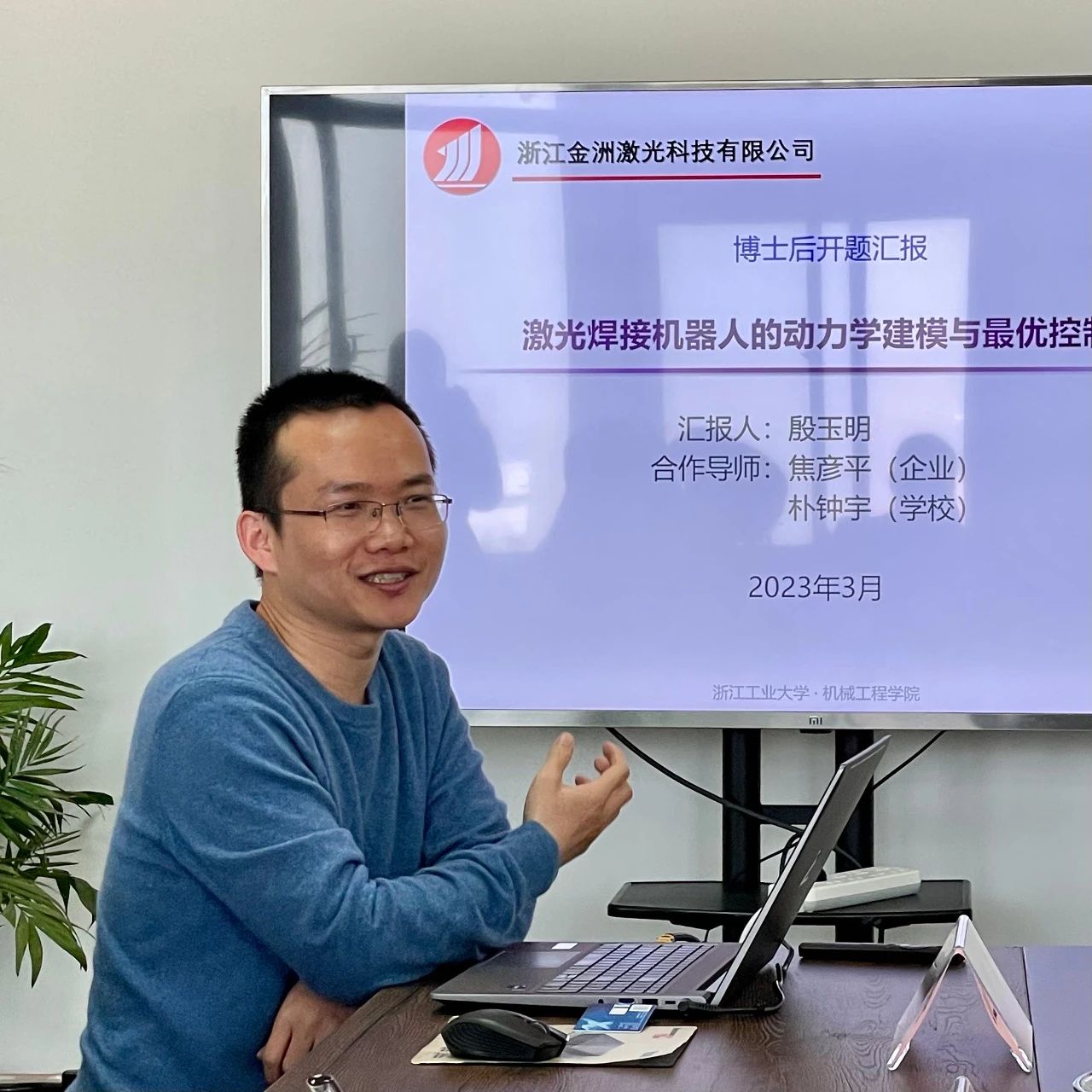 隨后殷玉明博士和陳泓諭博士分別就《激光焊接機器人的動力學(xué)建模與最優(yōu)控制》、《合金表面高效高質(zhì)量激光-力流變拋光新方法研究》兩項課題的研究現(xiàn)狀、研究內(nèi)容、研究方案及后期課程進度安排進行了詳細匯報。